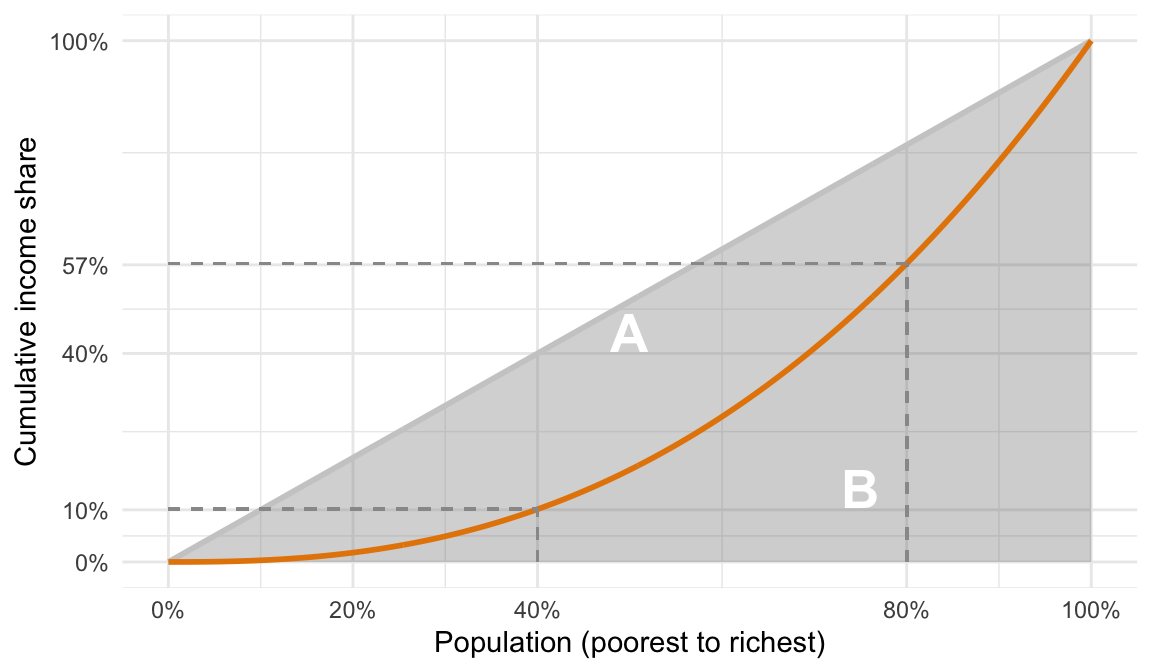 The diagonal is the line of equality — every X% of the population earns Y% of income. The bowed curve is the Lorenz curve (the actual distribution). Gini = A/(A+B): ranges from 0 (perfect equality) to 1 (perfect inequality).