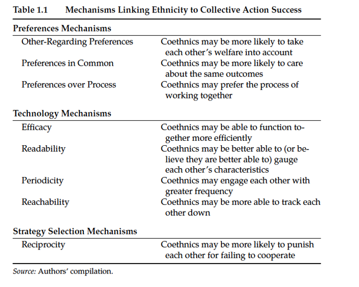 - Micro-level studies find that shared identity promotes collective action among “coethnics,” and prevents cooperation among “non-coethnics”